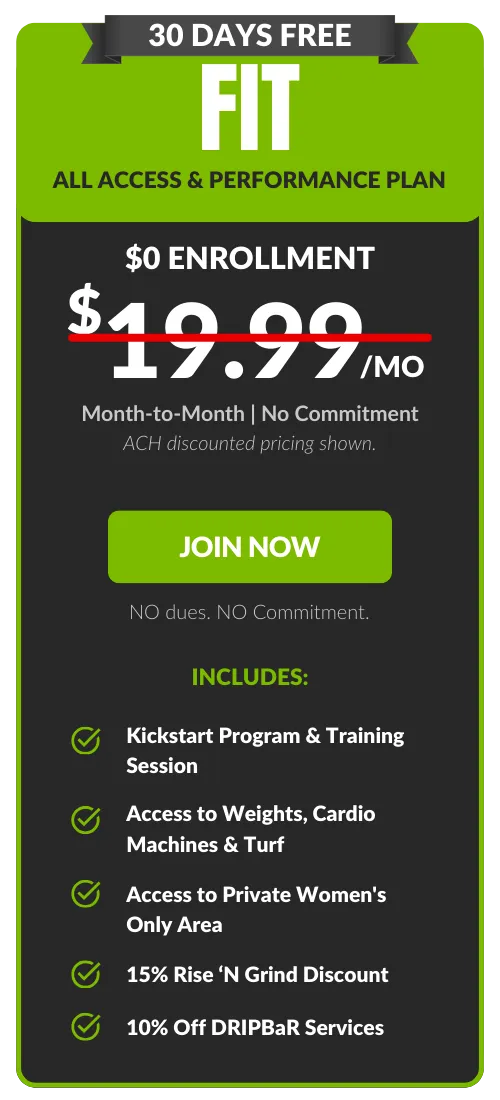 Free FIT add-on. Guest privileges are limited to FIT Amenities. All memberships are billed monthly to a checking account or credit card. An Annual Fee of $69.99 billed once per year in the member's second month of membership. Enrollment fee and taxes may apply. Choose your bank account to pay your Monthly Membership Dues and we’ll waive our one-time processing fee of $20.00. Plus SAVE $2.00 on your membership dues every month! 7-Day Satisfaction Guarantee. 30 day notice applies to all memberships. DRIPBaR is located in our Fit Factory Foxboro Location only. All Fit Factory members receive 10% Off DRIPBaR Services.