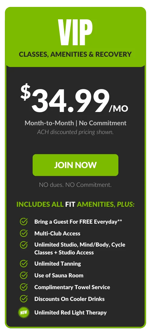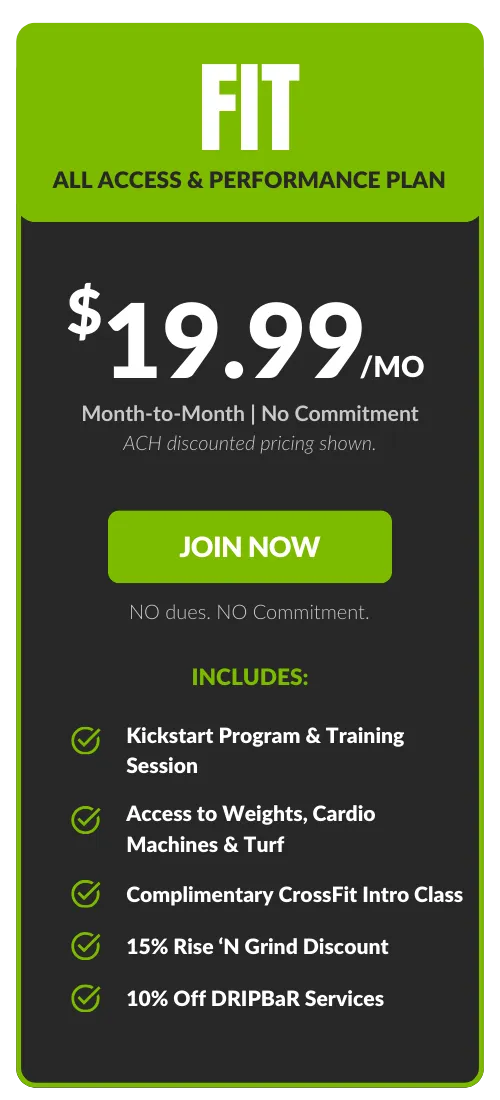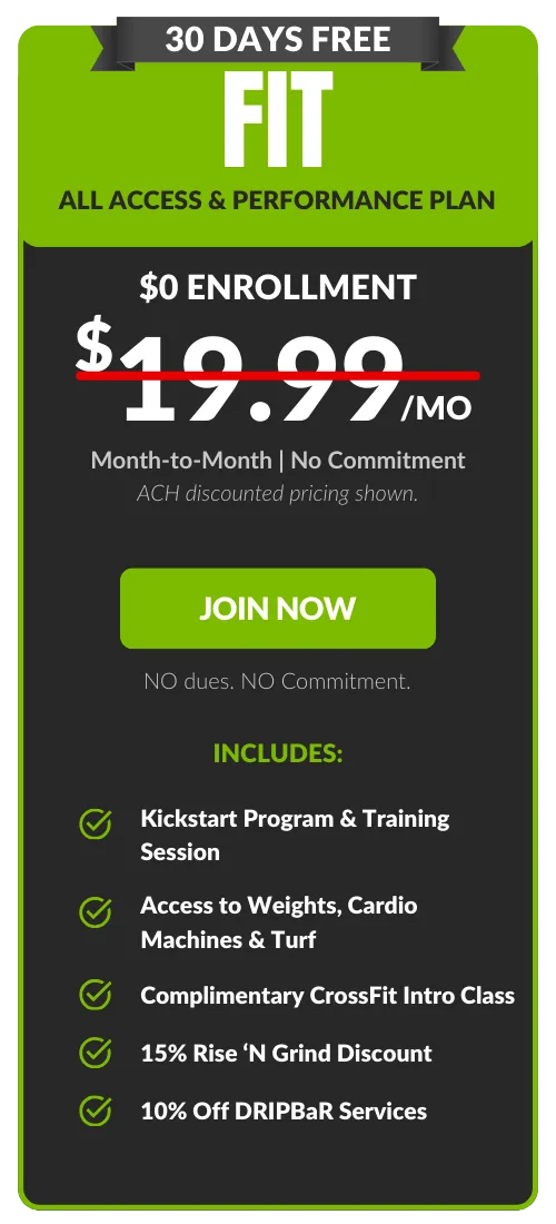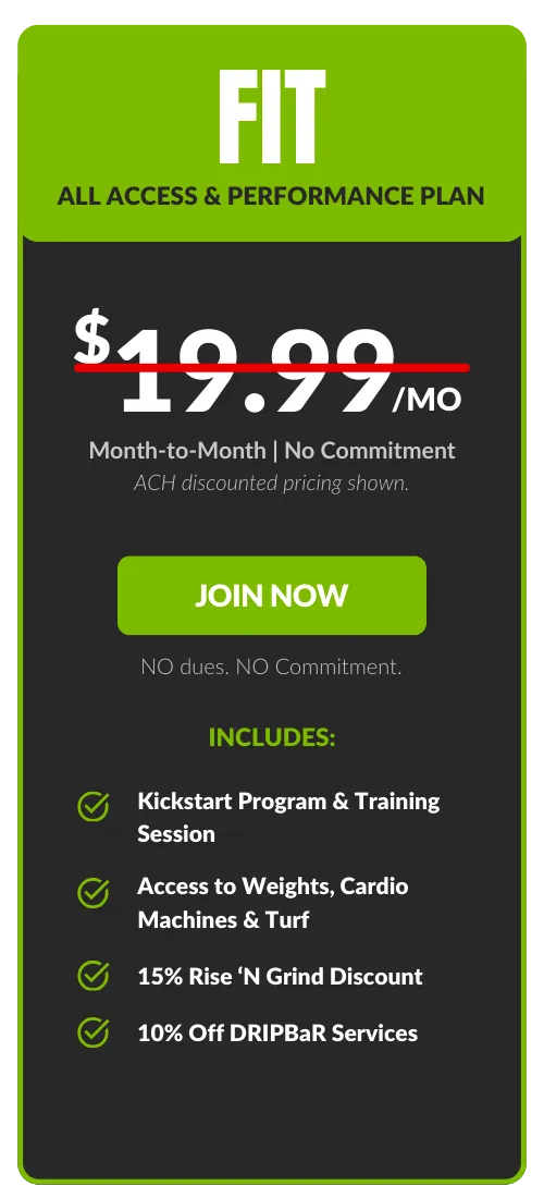 Free FIT add-on. Guest privileges are limited to FIT Amenities. All memberships are billed monthly to a checking account or credit card. An Annual Fee of $69.99 billed once per year in the member's second month of membership. Enrollment fee and taxes may apply. Choose your bank account to pay your Monthly Membership Dues and we’ll waive our one-time processing fee of $20.00. Plus SAVE $2.00 on your membership dues every month! 7-Day Satisfaction Guarantee. 30 day notice applies to all memberships. DRIPBaR is located in our Fit Factory Foxboro Location only. All Fit Factory members receive 10% Off DRIPBaR Services.