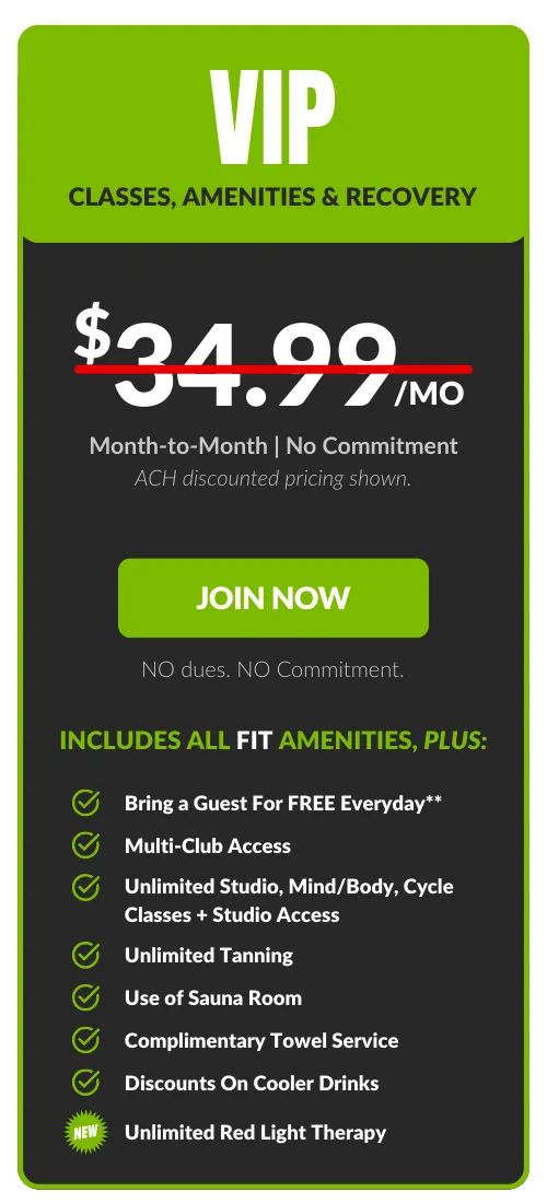*Free FIT Add-On and **Guest privileges are limited to FIT Amenities. All memberships are billed monthly to a checking account or credit card. An Annual Fee of $69.99 billed once per year in the member's second month of membership. Enrollment fee and taxes may apply. Choose your bank account to pay your Monthly Membership Dues and we’ll waive our one-time processing fee of $20.00. Plus SAVE $2.00 on your membership dues every month! 7-Day Satisfaction Guarantee. 30 day notice applies to all memberships.
