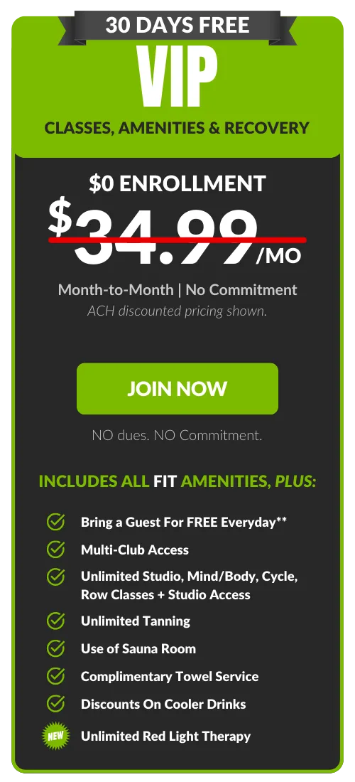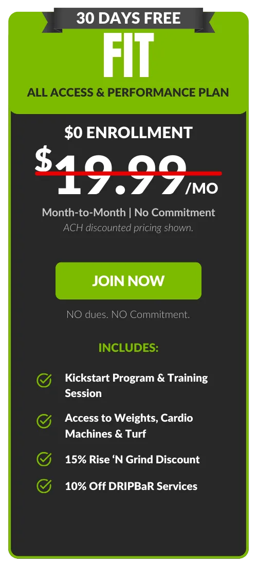 Free FIT add-on. Guest privileges are limited to FIT Amenities. All memberships are billed monthly to a checking account or credit card. An Annual Fee of $69.99 billed once per year in the member's second month of membership. Enrollment fee and taxes may apply. Choose your bank account to pay your Monthly Membership Dues and we’ll waive our one-time processing fee of $20.00. Plus SAVE $2.00 on your membership dues every month! 7-Day Satisfaction Guarantee. 30 day notice applies to all memberships. DRIPBaR is located in our Fit Factory Foxboro Location only. All Fit Factory members receive 10% Off DRIPBaR Services.